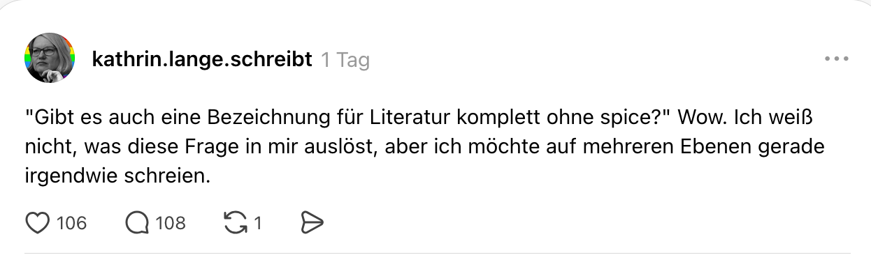 Wie schon erwähnt, lese ich in meinem Threads-Feed täglich Dutzende Male diese Frage in verschiedenen Versionen: »Gibt es eigentlich auch noch Genre xy ohne spice?«
